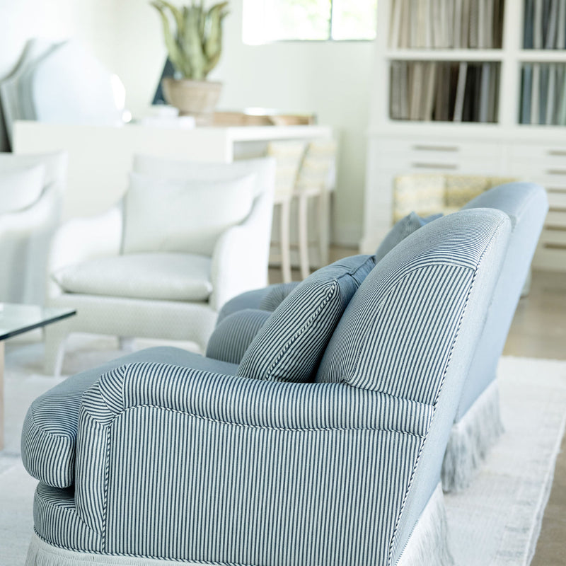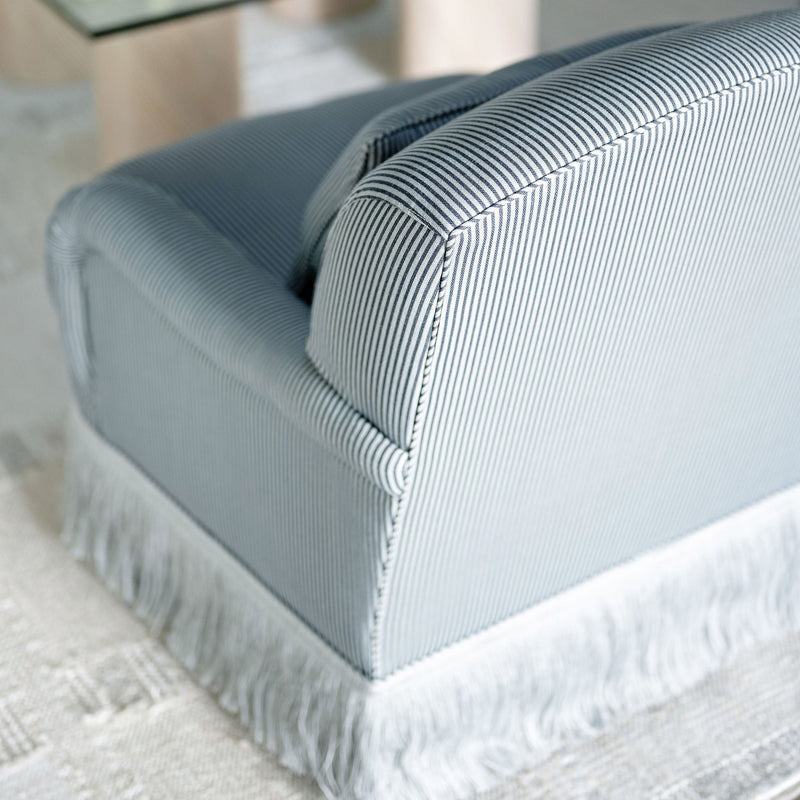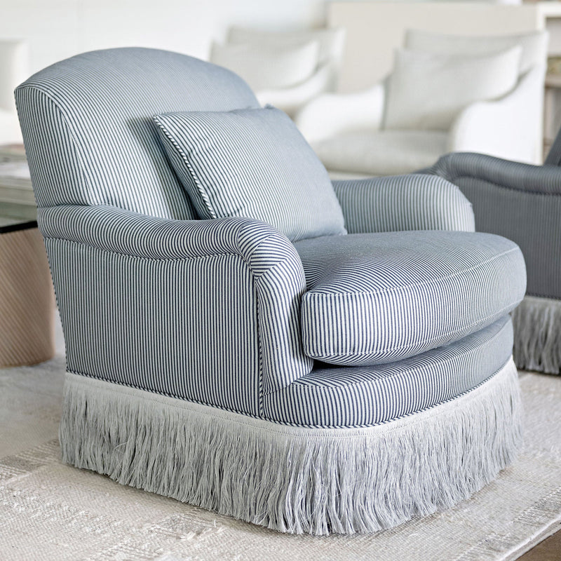 Add a touch of glamour to our classic English armchair showcasing our luxurious Linen Fringes. Comfortable & stylish, this larger seat features a plush cushion and curved arms. Add a contrast welt to complete the look.