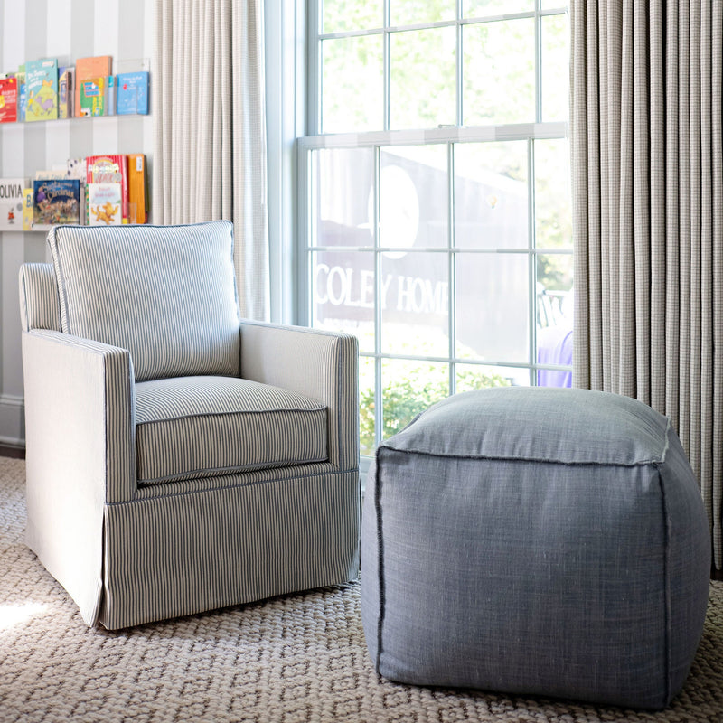 Our Pouf provides a plush, comfortable extra seat and a playful accent for the bedroom or playroom. It also serves as a comfortable footrest for our Nash Swivel Glider.